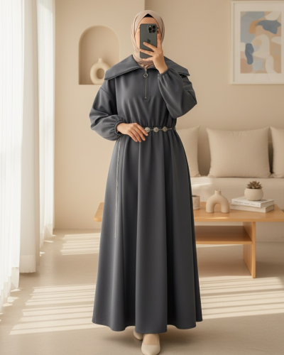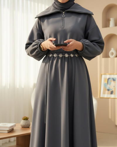 • Boğazlı Yarım Fermuarlı Beli Büzgülü Kemerli Scuba Elbise Füme