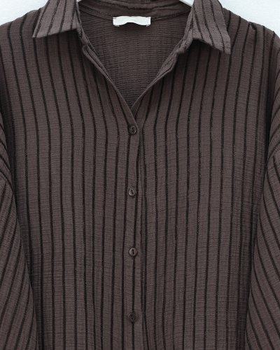 • Dikiş Çizgili Arkası Uzun Salaş Müslin Gömlek Kahve