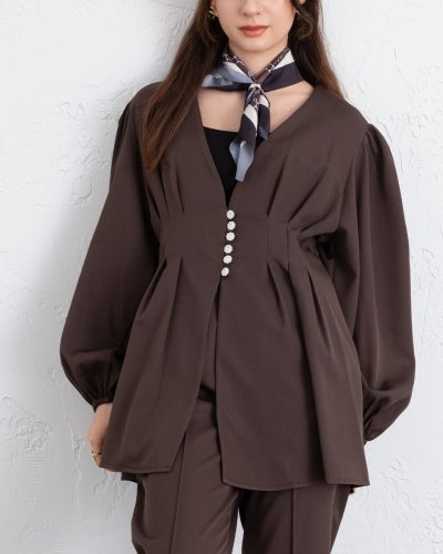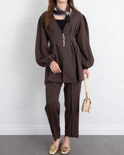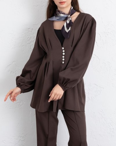 • Taşlı Düğmeli Kolu Lastikli Double Pantolonlu Takım K Kahve